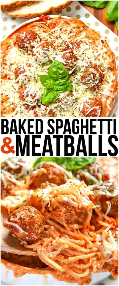 Baked Spaghetti and Meatballs is an easy dinner recipe of Italian Meatballs, Homemade Marinara Sauce, Al Dente Pasta, Ricotta Cheese, Mozzarella, Basil, and Parmesan Cheese.