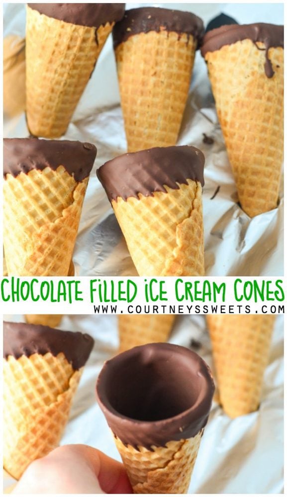 You can make delicious chocolate filled sugar cones or even waffle cones for storebought ice cream or even homemade ice cream. Such a simple recipe!! I use tinfoil to keep them standing, but you could easily use a small shot glass or even poke holes into a cardboard box.