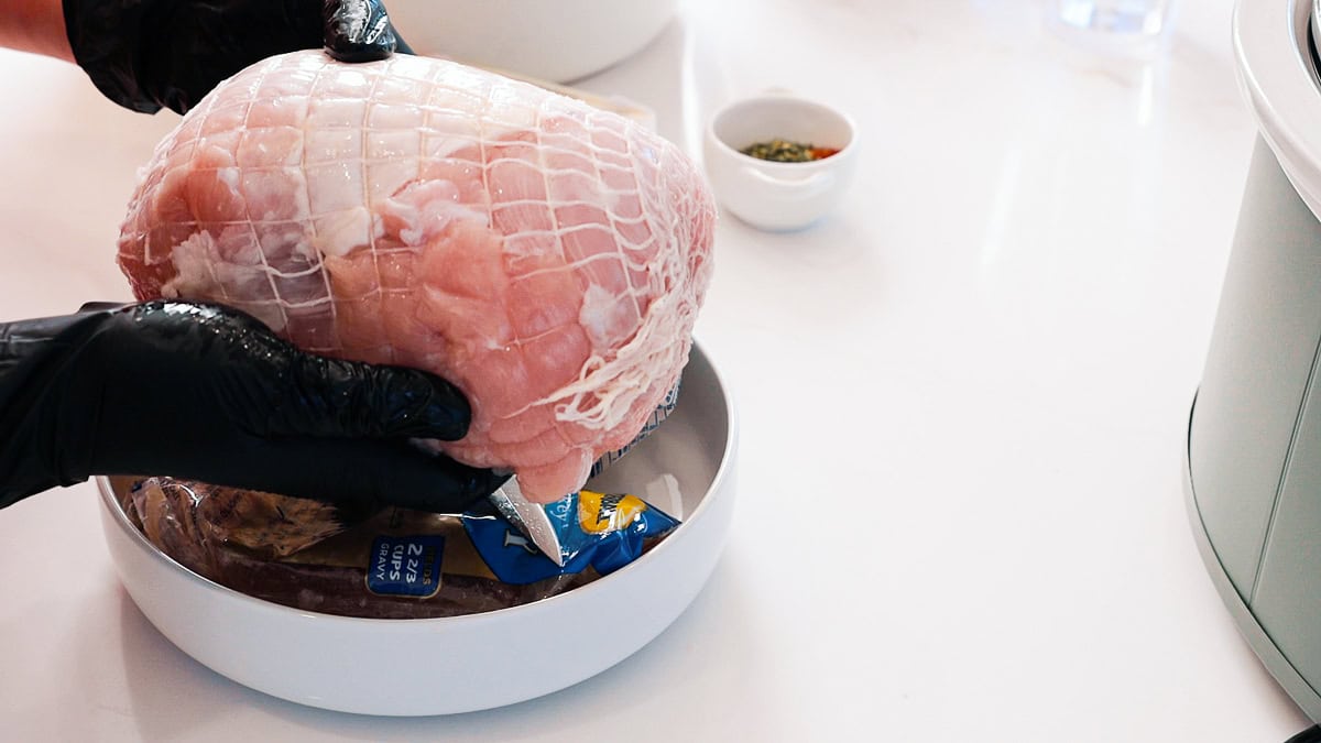 Remove the turkey breast from its packaging and discard any included sauces or gravy. Do not remove the mesh.